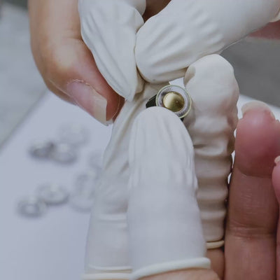 The housing is CNC-machined from a single block of pure titanium into a one-piece construction. It is then refined through a multi-stage electroplating process to achieve a smooth satin finish that enhances comfort. Each matched pair of shells requires up to seven days of processing.